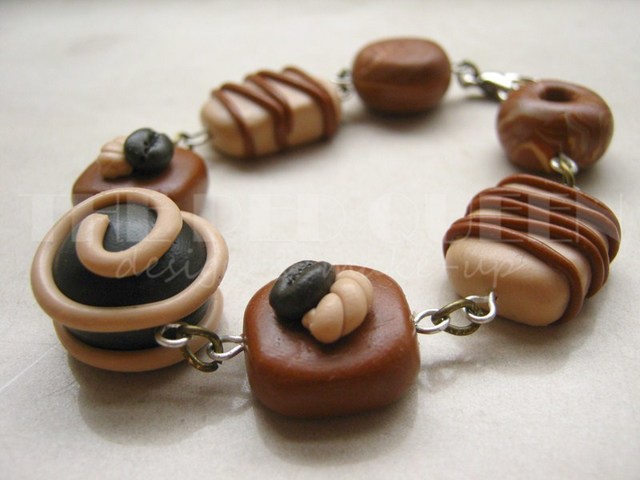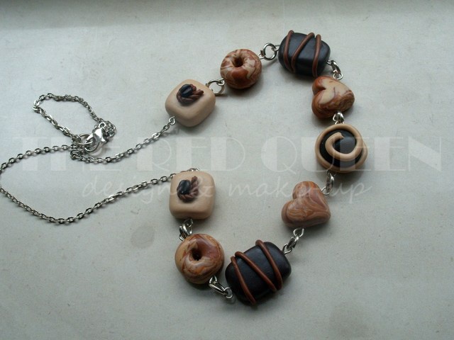 As the name states, this collection was inspired by different pralines. I created the bracelet first, after which I got an order to create some more items - all for the same person. The order included the bracelet, necklace and earrings. The person who ordered them likes warm, neutral tones so I just played with those shades of polymer clay.